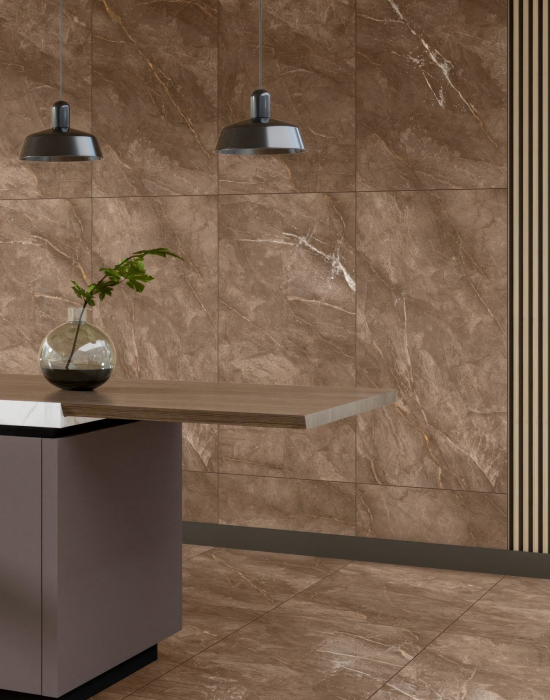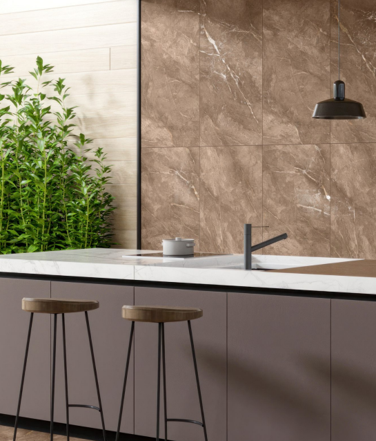 The warm brown marble look is perfect for a cozy and sophisticated kitchen. It offers a very high-end look in a super durable porcelain tile.