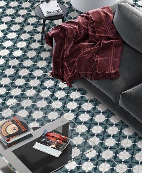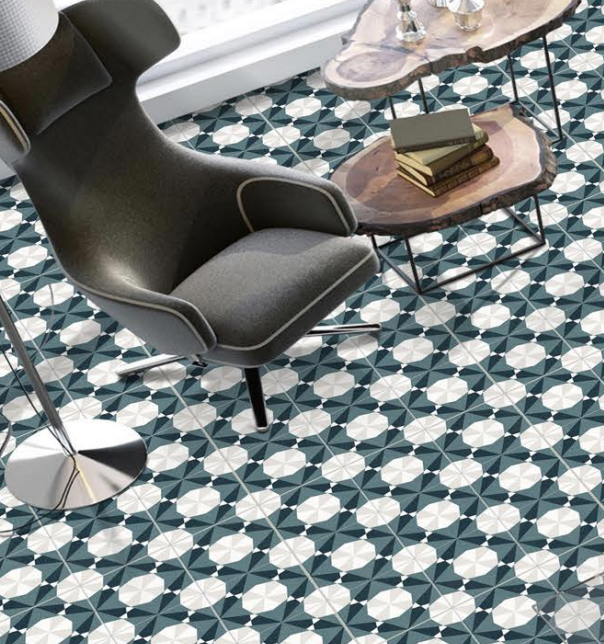 As seen in the image, the Altea Navy tile makes a powerful design statement. When the tiles are laid together, they form a large, repeating star-like pattern that is very impressive and artistic. The durable porcelain and practical matte finish make this a great choice for adding a unique, high-end touch to any area of your home, from the living room to a grand entryway.