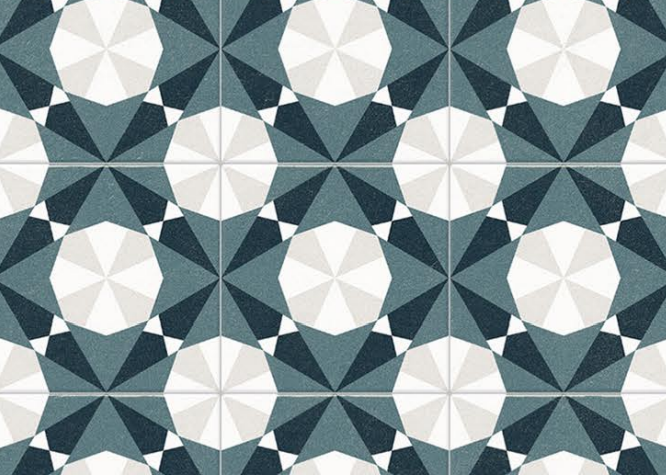 The Altea Navy tile has an intricate, geometric pattern like a traditional encaustic tile. It features a sophisticated color combination of navy blue, grey-blue, and cream.