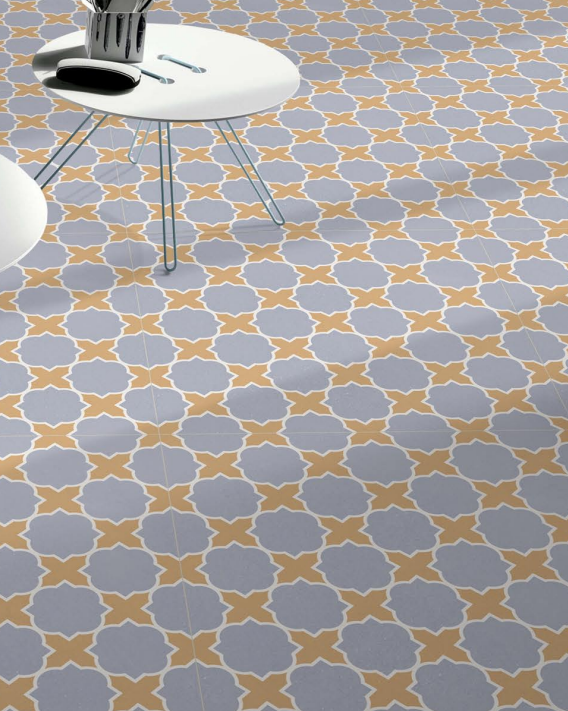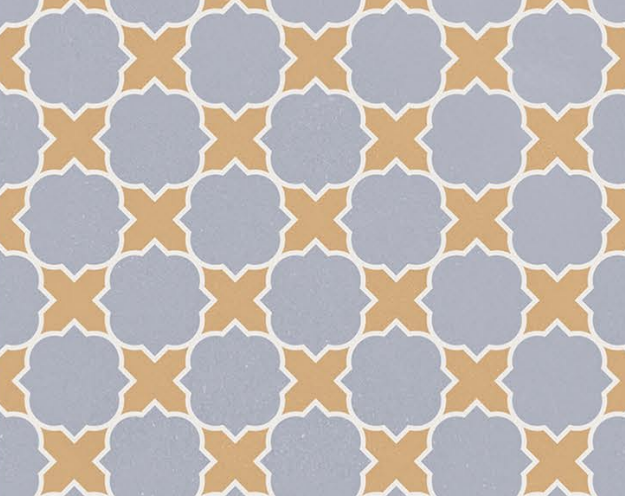 The Artisan Craft tile has a classic, repeating clover-like pattern. It uses a unique and pretty color mix of dusty blue and buttery yellow.