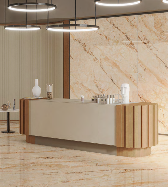 The impressive size of this tile is its greatest feature. Using a 120x180cm slab means you can create a floor or wall that looks like it was made from a single, continuous piece of expensive Italian marble. This achieves the perfect “seamless” effect. Its warm, classic pattern and the bright, reflective polished surface bring a timeless and magnificent feeling to any high-end home or commercial space.