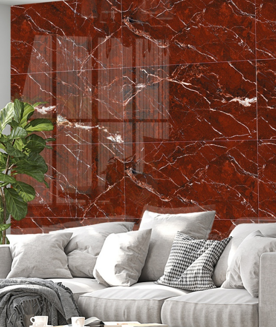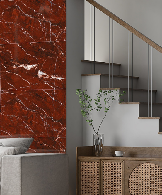 The Cabalo Red tile transforms a room into a showcase of modern luxury. The polished, mirror-like surface reflects light beautifully, making the deep red color look even richer and more dynamic. It provides a stunning backdrop that is full of energy and sophistication. This durable porcelain tile allows you to get the look of a very rare and exotic red marble, in a practical and easy-to-maintain format.