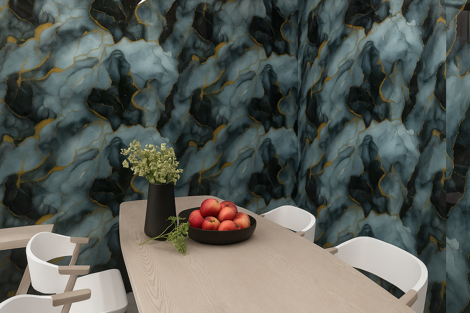 The tile features a fluid abstract pattern, simulating luxury marble with contemporary flair. The blend of moody tones and rich gold veining provides a dramatic visual texture, ideal for creating feature walls.