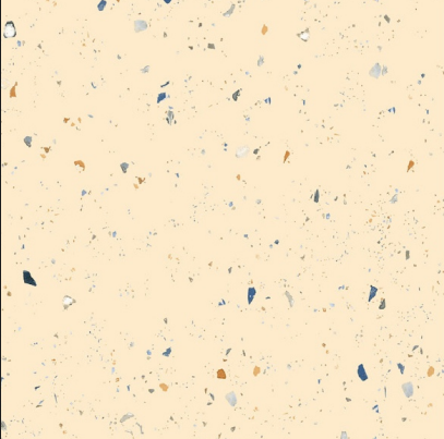 The CR Toranto Ivory tile has a warm, ivory-colored background. It features a classic terrazzo pattern with scattered chips of grey, beige, and blue.