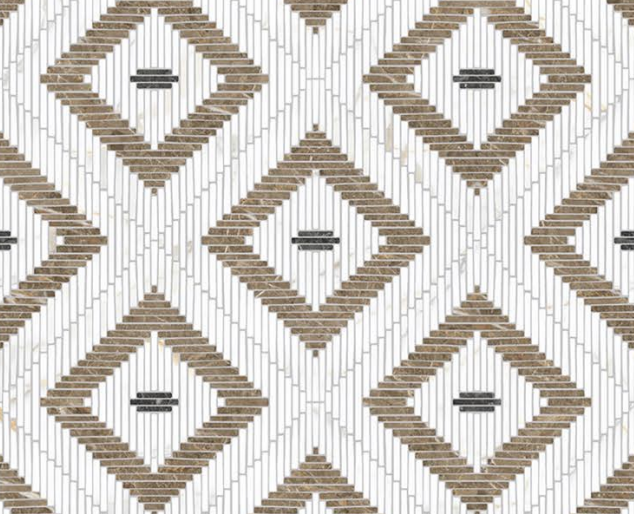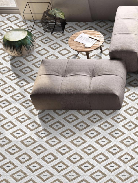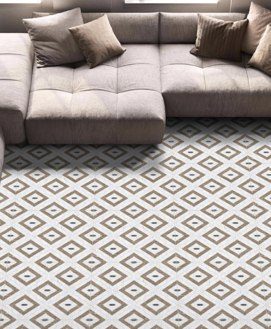 The Crystal Beige tile has a clever design that looks like a woven fabric rug. It features a repeating geometric diamond pattern in warm beige and cream.
