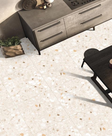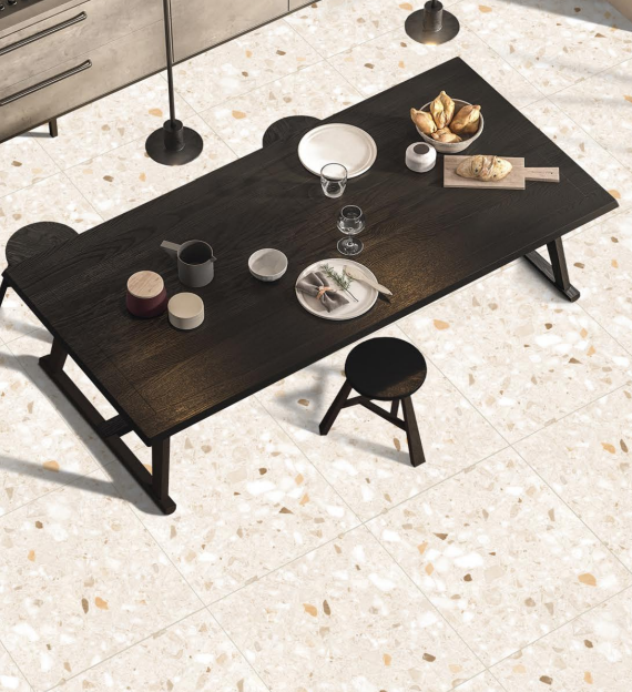 The Elara Beige tile is a fantastic choice for busy areas, as seen in the kitchen and dining room image. The terrazzo pattern is not only stylish but also very good at hiding everyday crumbs and footprints, making it easy to live with. The durable porcelain material and the easy-to-clean matte finish make it a smart and long-lasting option for any home that values both high style and practicality.