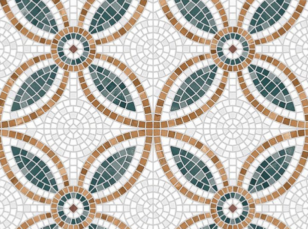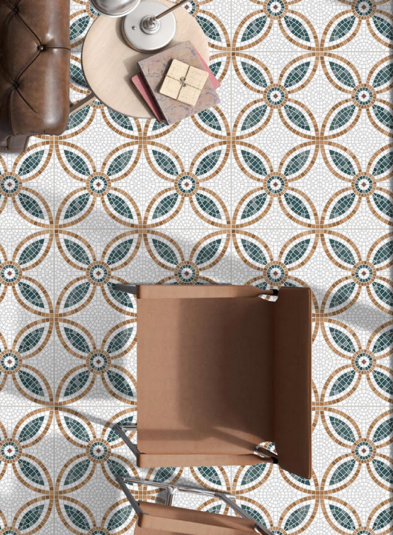 The Elegant Breeze tile has a clever design that looks like a classic, detailed mosaic. It features a beautiful pattern of intersecting circles in deep teal, tan, and white.