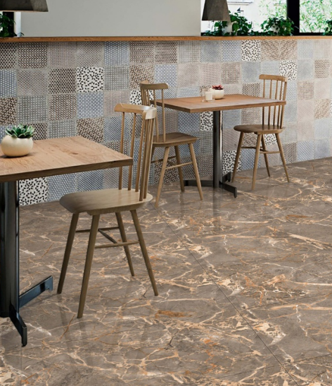 The Infinia Agasta Brown tile is as practical as it is beautiful. Its durable porcelain body is perfect for busy floors in commercial spaces like cafes and restaurants, as seen in the image. The glossy finish is easy to clean and adds a touch of luxury. The rich, detailed pattern is great for hiding daily dust, making it a smart choice for high-traffic areas.