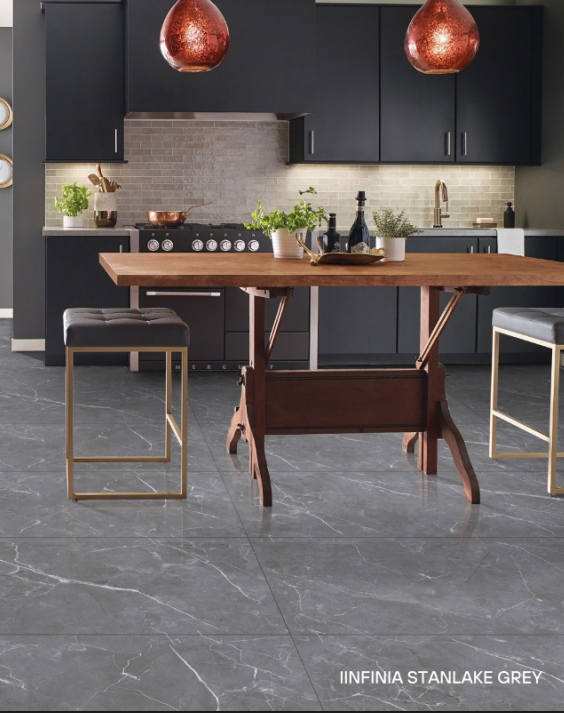 The Infinia Stanlake Grey tile comes in a large 600x1200mm size, which helps make rooms look sleek and spacious with fewer grout lines. Its glossy finish provides a polished shine that is easy to clean and reflects light beautifully. With at least four different patterns, the final installation looks very natural and varied, giving the appearance of a real marble slab.