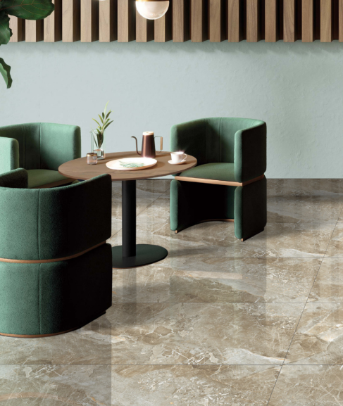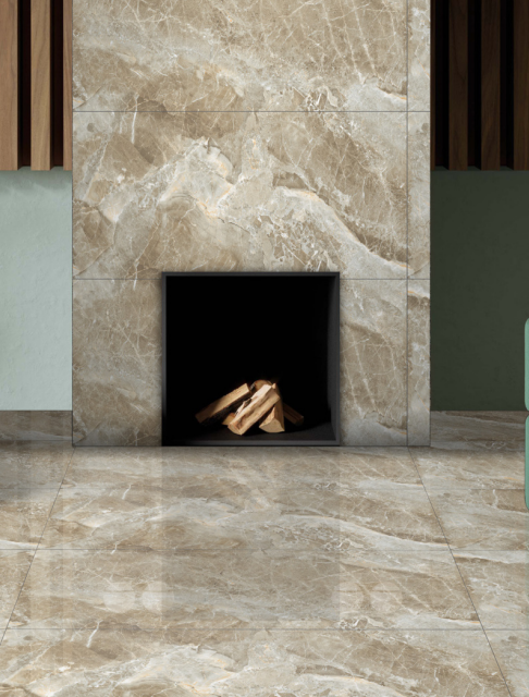 This tile is designed to make a bold impression. Its large 600x1200mm size gives the floor and the fireplace wall in the image a grand, seamless look with very few lines. Because it’s made from strong porcelain, it’s a great practical choice that can handle the busy traffic of a restaurant or lounge. With four random patterns, it has a very realistic and dynamic look, like a real slab of exotic stone.