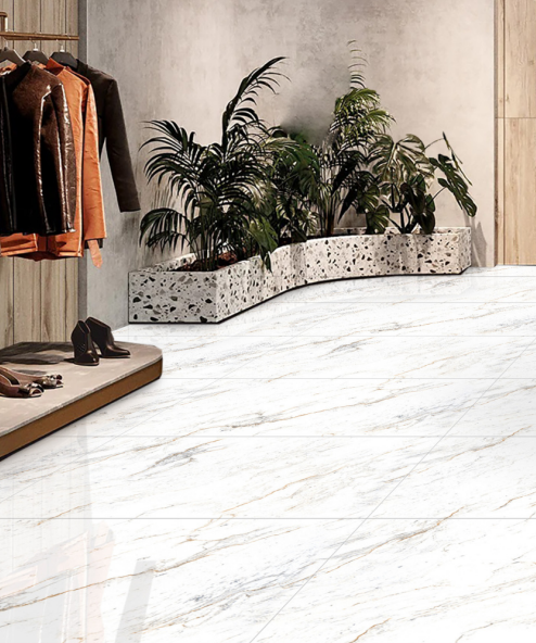 Looking to give your shop or home a bright, high-end marble look? The Infinia Metro White tile is a stunning choice. It has a classic and luxurious white marble design, with a bright white background and beautiful, flowing veins of soft grey and warm, rusty-gold. As you can see in the modern retail store photo, its glossy finish creates a very bright, clean, and impressive floor that welcomes customers. This is a perfect white and gold marble tile for a large format commercial floor.