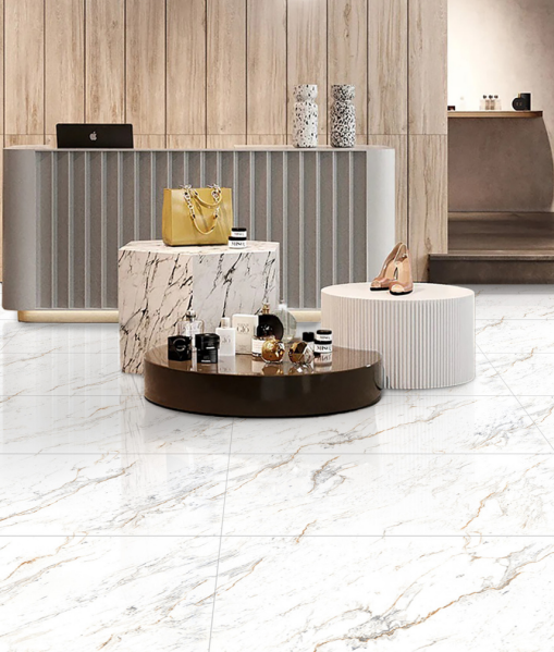 This tile is designed to look amazing and be tough enough for busy places. Its large 600x1200mm size gives the floor in the boutique a grand and seamless look with very few lines between the tiles. Because it’s made from strong porcelain, it’s a great practical choice that can handle lots of foot traffic while being super easy to clean. With four random patterns, it has a very realistic and natural look, like a single slab of polished stone.