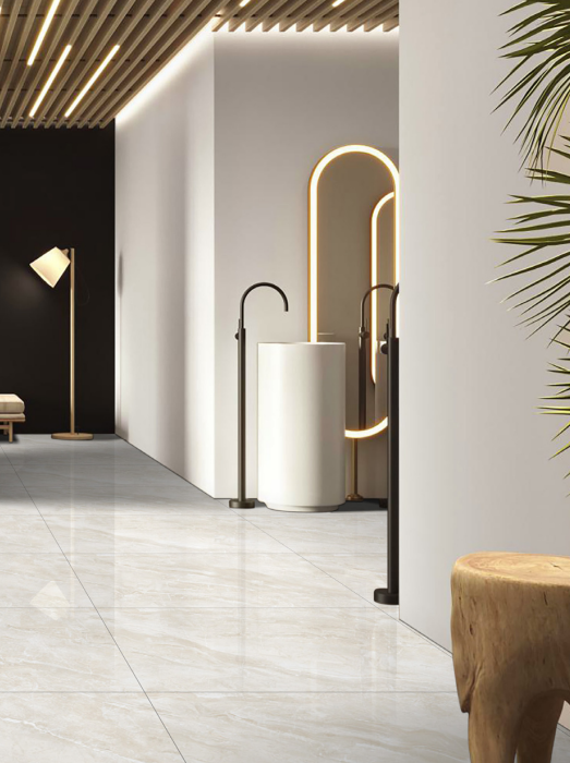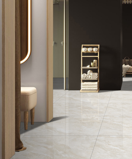 Looking for a tile that makes a space look bright, clean, and super classy? The Infinia Wrangler Crema is a fantastic choice. It has a light and subtle marble design, with a soft, greyish-beige color and very faint, cloudy patches of creamy veins. As you can see in the modern public washroom in the photo, its glossy finish creates a very bright and clean look, perfect for high-end spaces. This is a great light beige porcelain tile for a large format commercial floor.