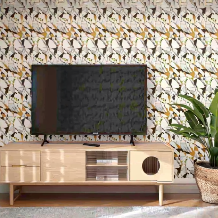 Embrace bold, contemporary style with the NW-132 tile, a stunning surface that captures the essence of modern terrazzo and abstract stone mosaics. This tile features a high-impact graphic pattern composed of large, fragmented shapes in a sophisticated color palette of crisp white, deep black, and warm, earthy gold.