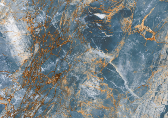 The Phantom Natural tile has the dramatic look of a rare, exotic stone. It features a deep, dusty blue background with bold, fractured veins of rusty copper.