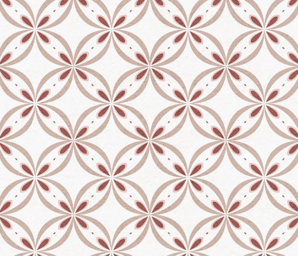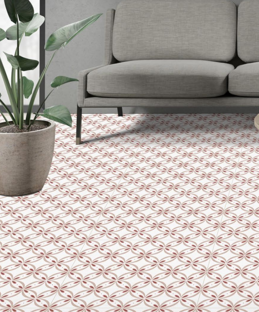 Create a beautiful and elegant space with the Riau Decor tile. This tile features a stunning design inspired by classic, handcrafted decorative tiles. As seen in the modern living room in the image, it has an intricate geometric pattern of intersecting circles in a soft color palette of dusty rose and off-white. With its classic matte finish, this tile is perfect for creating a decorative floor that adds a gentle, artistic touch to your home.