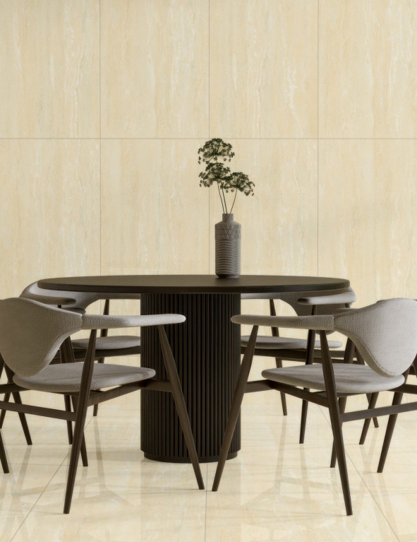 The soft, creamy beige color makes a dining room feel welcoming and luxurious. Its large size and glossy finish create a clean, high-end, and seamless look.